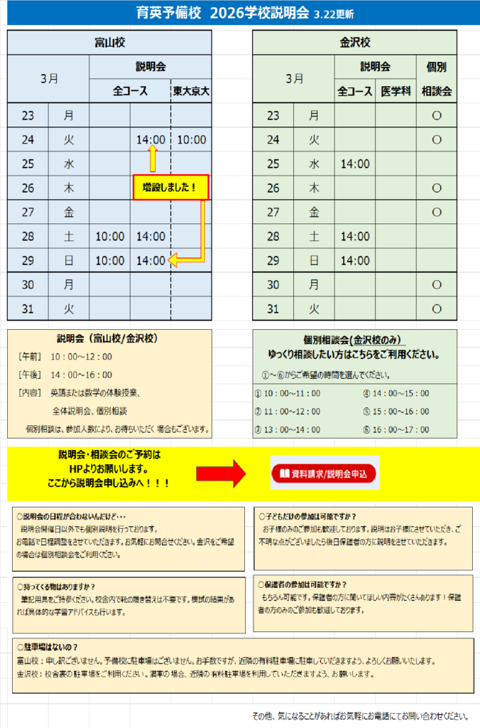 入校説明会日程(富山校/金沢校)3/23~ まだ間に合います!