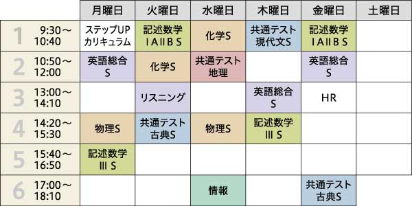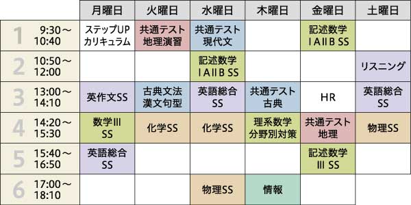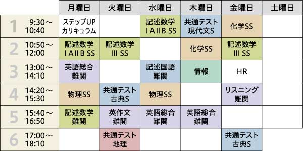 理系教科に特化した時間割構成になります。記述数学を週4回、理科を週4回と理系教科を大幅に強化する時間割です。1学期・2学期ともに数学は予習・復習・添削を行い、基本事項の確認と2次力の底上げ、解答の作り方を徹底して学習していきます。理科に関しても同様です。授業の予習・復習・自主学習等で数学・理科に触れる機会が大幅に増えます。また、英語に関しても文法・作文・解釈・長文と多方面で授業を行い2次試験に対応できる力をつけていきます。2学期以降は演習の授業も豊富にあり、実力の確認・底上げを行います。